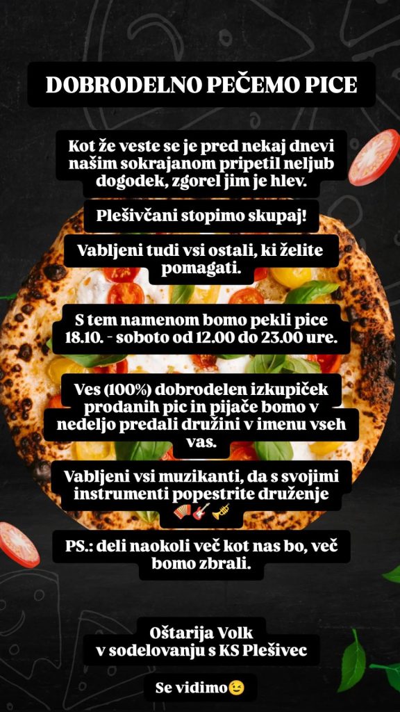 Danes med 12. in 23. uro, v Oštariji Volk pečejo dobrodelne pice. Ves izkupiček od prodanih pic in pijače bodo jutri predali družini, ki ji je v začetku oktobra zgorel hlev.