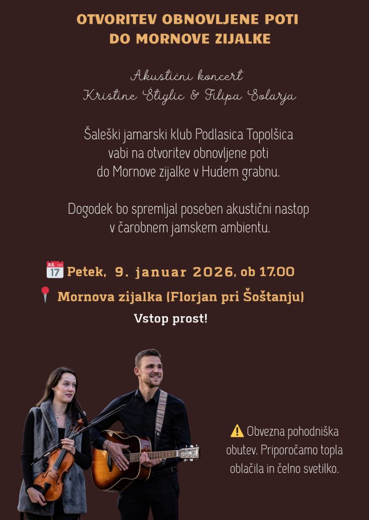 Šaleški jamarski klub Podlasica Topolšica vabi na odprtje obnovljene poti do Mornove zijalke v Hudem grabnu.