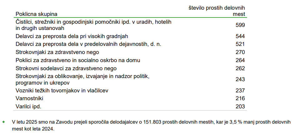 Delodajalci so decembra Zavodu sporočili 9.489 prostih delovnih mest, od tega jih je bilo največ s področja zdravstva in socialnega varstva, predelovalnih dejavnosti, gradbeništva ter izobraževanja, so decembra Zavodu prijavili 9.489 prostih delovnih mest. Največ povpraševanja je bilo po delavcih v naslednjih poklicnih skupinah: