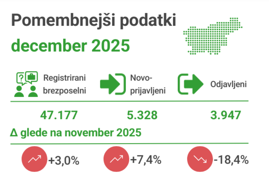 Konec decembra 2025 je bilo v evidenci Zavoda registriranih 47.177 brezposelnih oseb, če se ozremo na november, to pomeni 1.381 oseb oziroma 3,0 % več. V primerjavi z decembrom 2024 se je število brezposelnih povečalo za 139 oseb oziroma 0,3 %.
