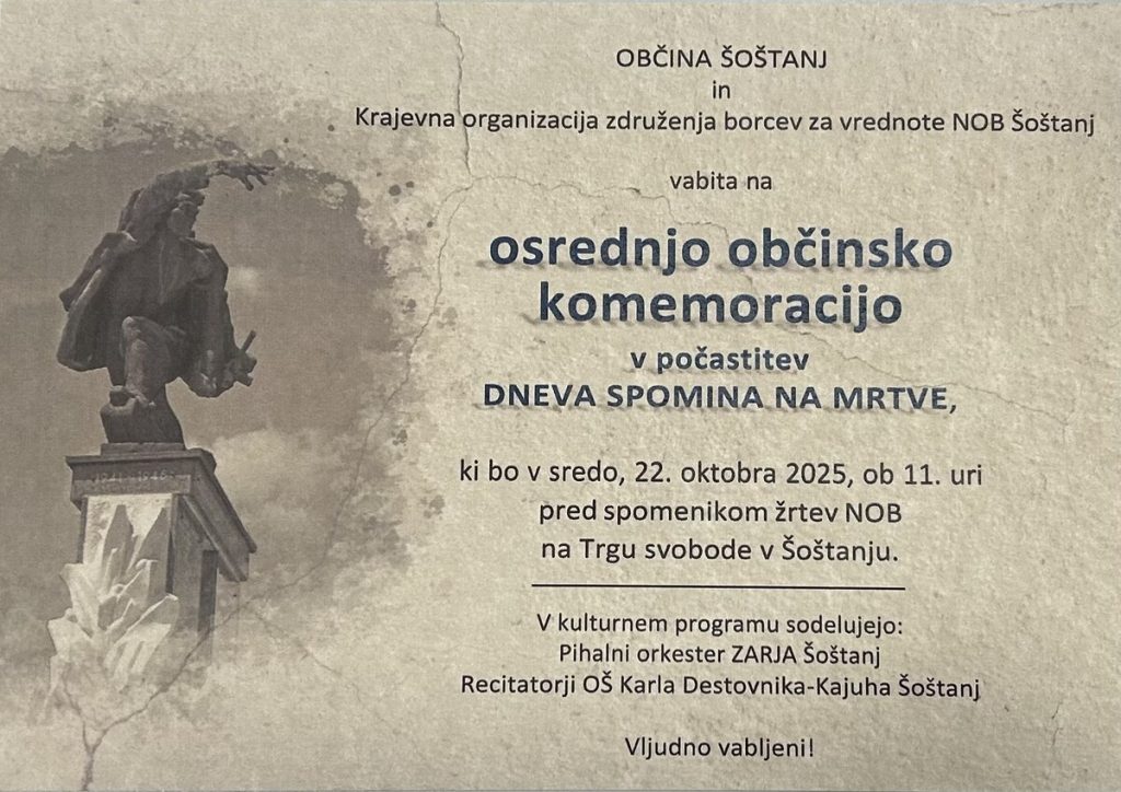 Občina Šoštanj in KO združenja borcev za vrednote NOB Šoštanj vabita na osrednjo občinsko komemoracijo v počastitev dneva spomina na mrtve, ki bo v sredo, 22. oktobra 2025, ob 11. uri pred spomenikom žrtev NOB na Trgu svobode v Šoštanju.
