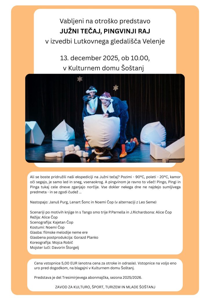 Enotna cena vstopnic za otroke in odrasle je 5 evrov, za nakup pa bodo na voljo eno uro pred dogodkom, na blagajni v Kulturnem domu Šoštanj.