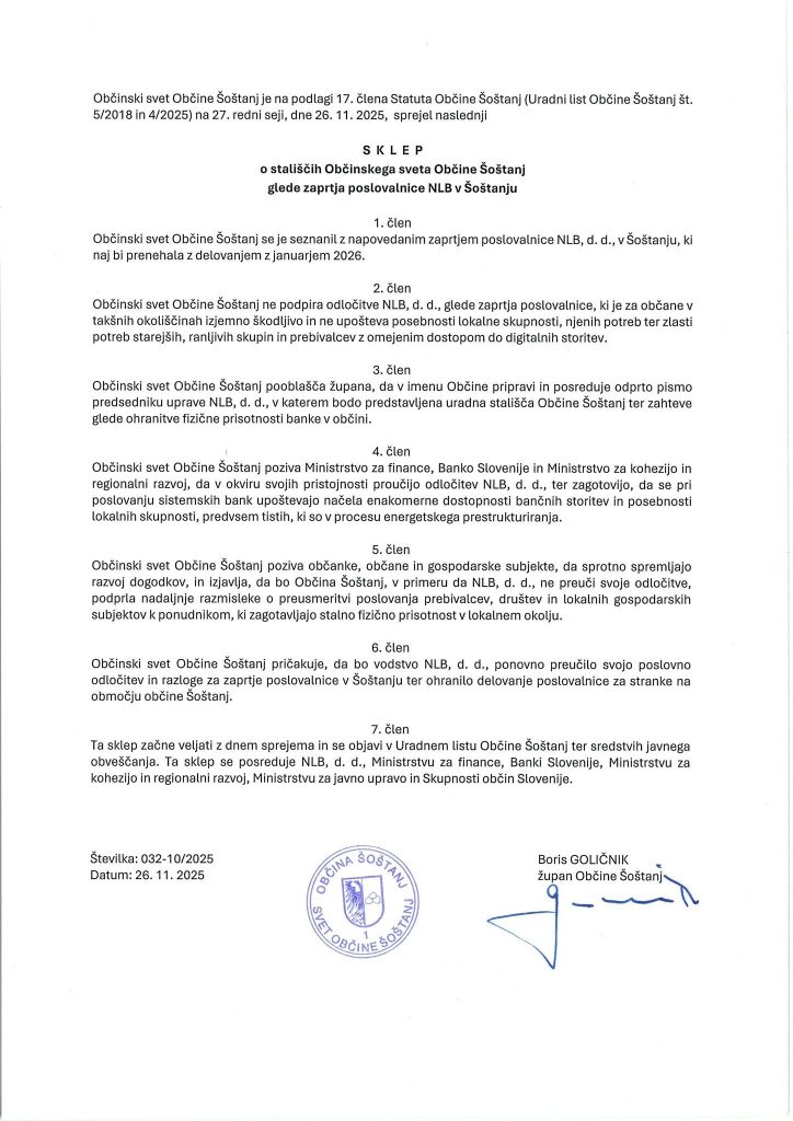 Ena izmed točk dnevnega reda tudi zaprtje poslovalnice NLB v Šoštanj