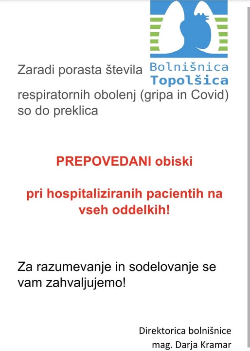 Zaradi povečanega števila respiratornih obolenj(gripa in covid-19), so v Bolnišnici Topolšica uvedli prepoved obiskov hospitaliziranih pacientov na vseh oddelkih. Ukrep velja do preklica.