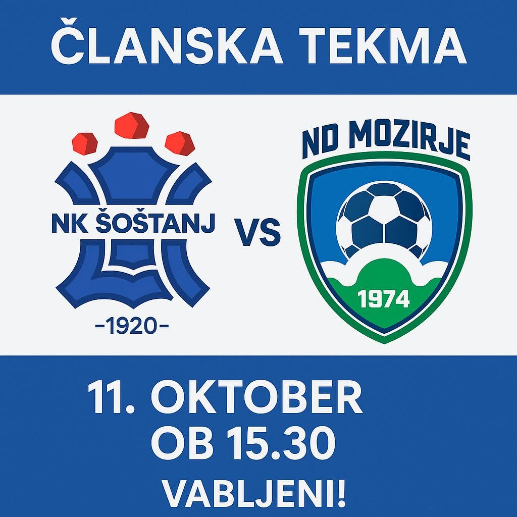 V soboto, 11. oktobra, ob 15.30 uri vabljeni na stadion pod Vilo Široko, kjer bo članska ekipa Nogometnega kluba Šoštanj odigrala člansko tekmo proti ekipi ND Mozirje.