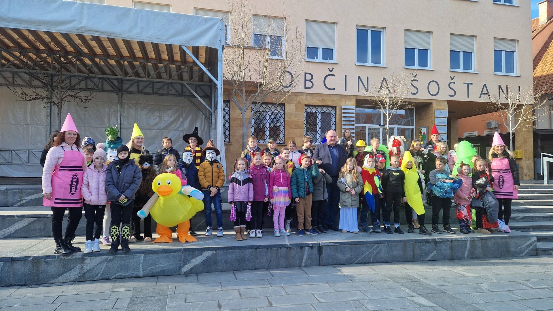 S petjem, plesom in dobro voljo so dopoldne županu Borisu Goličniku in njegovim sodelavcev popestrile maškare iz Osnovne šole Karla Destovnika-Kajuha Šoštanj in Vrtca Šoštanj - skupaj z razigranimi učiteljicami in vzgojiteljicami.